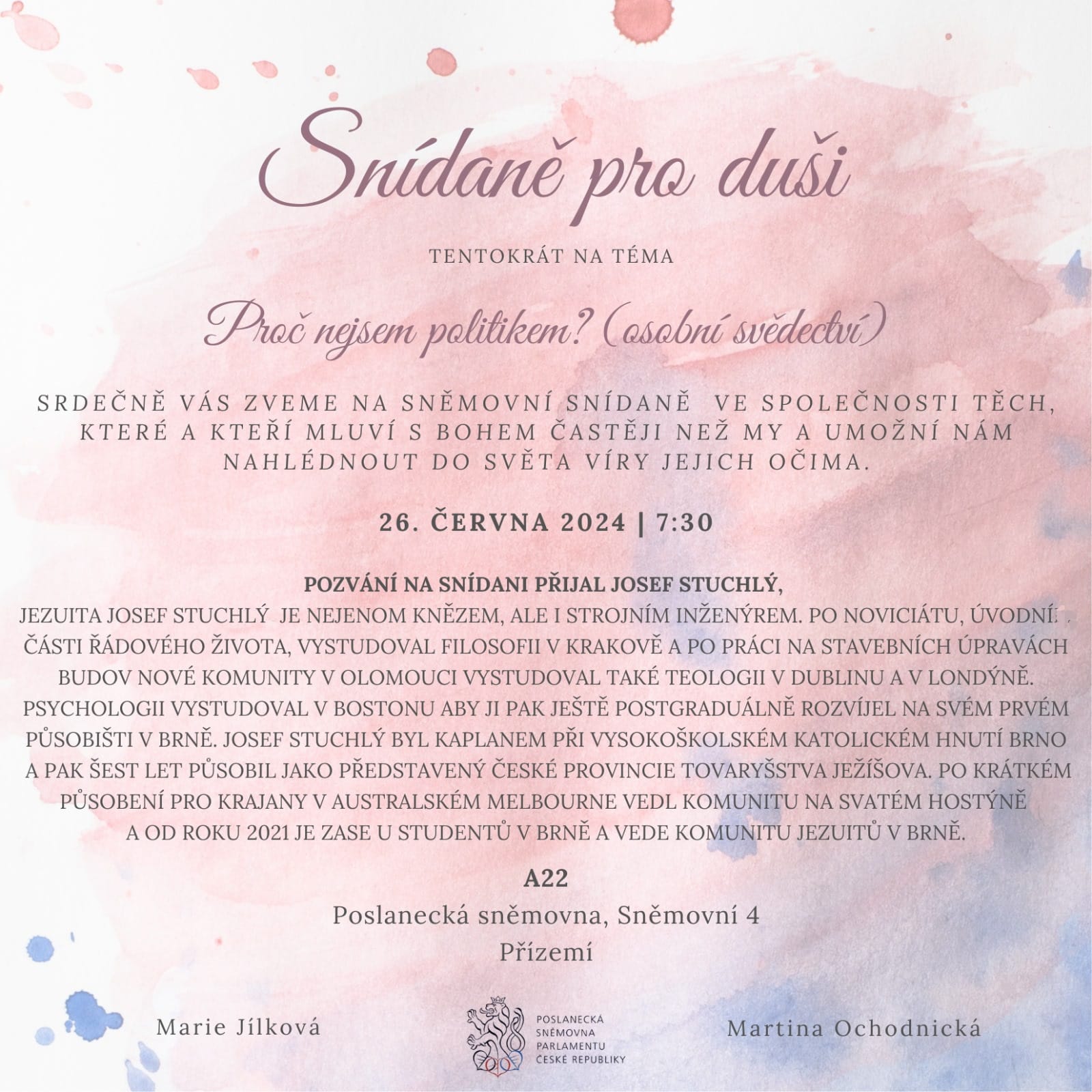 „Proč nejsem politikem…“ vysvětloval jezuita Josef Stuchlý, strojní inženýr a kněz. Po noviciátu, úvodní části řádového života, vystudoval filosofii v Krakově a po práci na stavebních úpravách budov nové komunity v Olomouci vystudoval také teologii v Dublinu a v Londýně. Psychologii vystudoval v Bostonu, aby ji pak ještě postgraduálně rozvíjel na svém prvém působišti v Brně. Josef Stuchlý byl kaplanem při Vysokoškolském katolickém hnutí Brno a pak šest let působil jako představený České provincie Tovaryšstva Ježíšova. Po krátkém působení pro krajany v australském Melbourne vedl komunitu na Svatém Hostýně a od roku 2021 vede komunitu jezuitů v Brně.